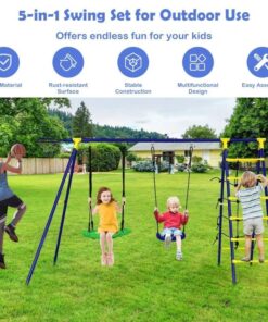 Ultimate 5-In-1 Outdoor Kids Swing Set with Sturdy A-Frame Metal Construction and Secure Ground Stakes
