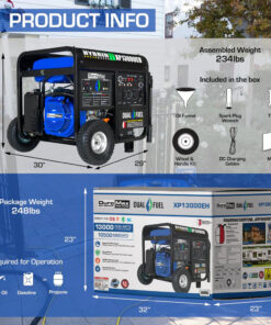 The all new DuroMax XP13000EH is a dual fuel workhorse powered by a 500cc OHV Engine and runs on gasoline or propane. With 10,500 watts of running power and the ability to surge up to 13,000 watts, this generator can power household essentials such as lights, small and large appliances, and your home’s central A/C system. The power panel has individual breakers to prevent overloading and keep everything safe.