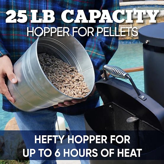 - Efficient Pellet Fuel System: 25 lb. gravity-fed hopper allows for 5 hours on high and 7 hours on low.