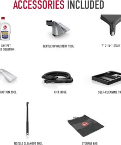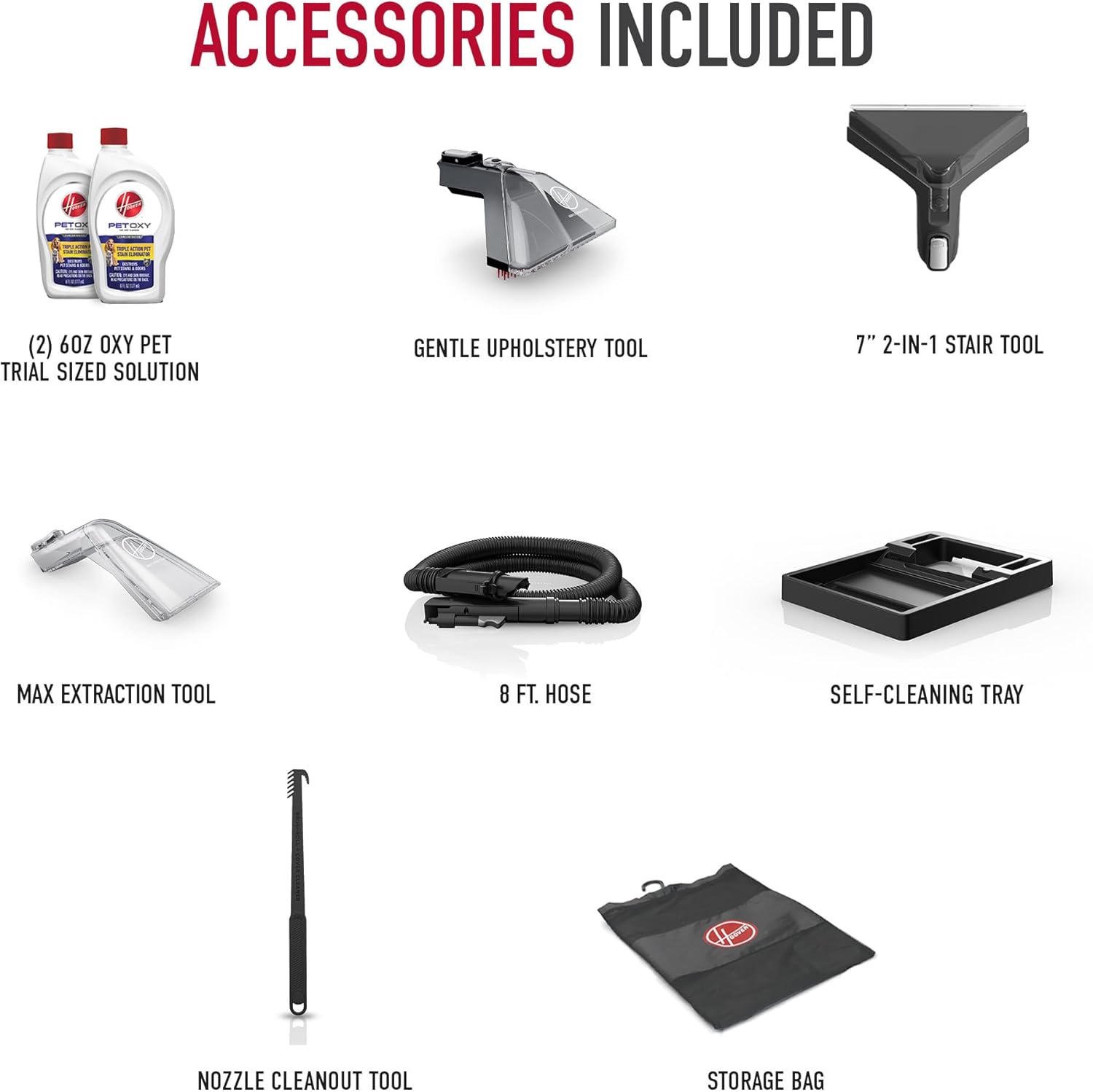 - AUTO MIX: This Hoover carpet cleaner machine has an Auto Mix feature that precisely mixes and dispenses solution for optimal carpet washing. Package includes 2-in-1 Pet Tool, Stair Tool, 8 ft. hose, accessory storage bag and sample cleaning solution.