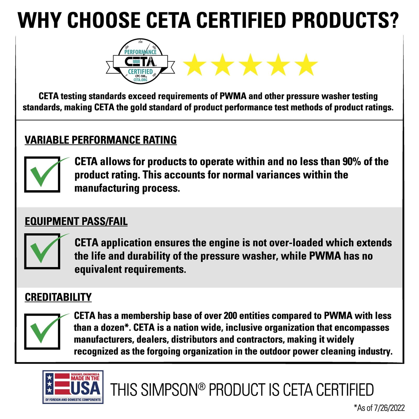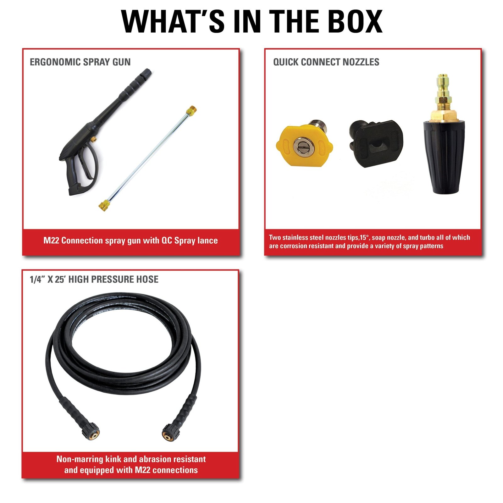 This easy to use electric pressure washer provides optimal performance. The Clean Machine by SIMPSON features a hassle-free SIMPSON motor and reliable, maintenance-free OEM Technologies axial cam pump with thermal relief with an on-board soap tank for convenience. The 1/4-inch x 25-foot MorFlex® hose is non-marring, highly flexible and abrasion resistant. Never-flat wheels provide ease of maneuverability across various terrains. Ideal for cleaning driveways, garage floors, concrete or tile patios, home exteriors, vehicles, fences, boats, trailers, pool areas and more. For both indoor and outdoor use. Hassle-free SIMPSON brushless electric induction motor Reliable, maintenance-free OEM Technologies axial cam pump with thermal relief with thermal relief 1/4-In x 25-Ft high pressure hose is non-marring, flexible and abrasion resistant Steel frame construction with powder coated finish for durability and corrosion resistance 10-In never-flat wheels for ease of maneuverability across various terrain Three quick connect nozzle tips: 15 deg, turbo nozzle, and soap to use for a variety of cleaning applications Convenient on-board detergent tank for simple soap application Includes 35-Ft GFCI power cord for outdoor use 1 Year limited consumer motor warranty | 1 year limited consumer pump warranty | 1 year limited consumer frame warranty | 90 day limited accessory warranty CA Residents: Prop 65 Warning(s) Prop65 Warning Label PDF Use and Care Manual PDF Lighting Facts PDF Operating Manual PDF